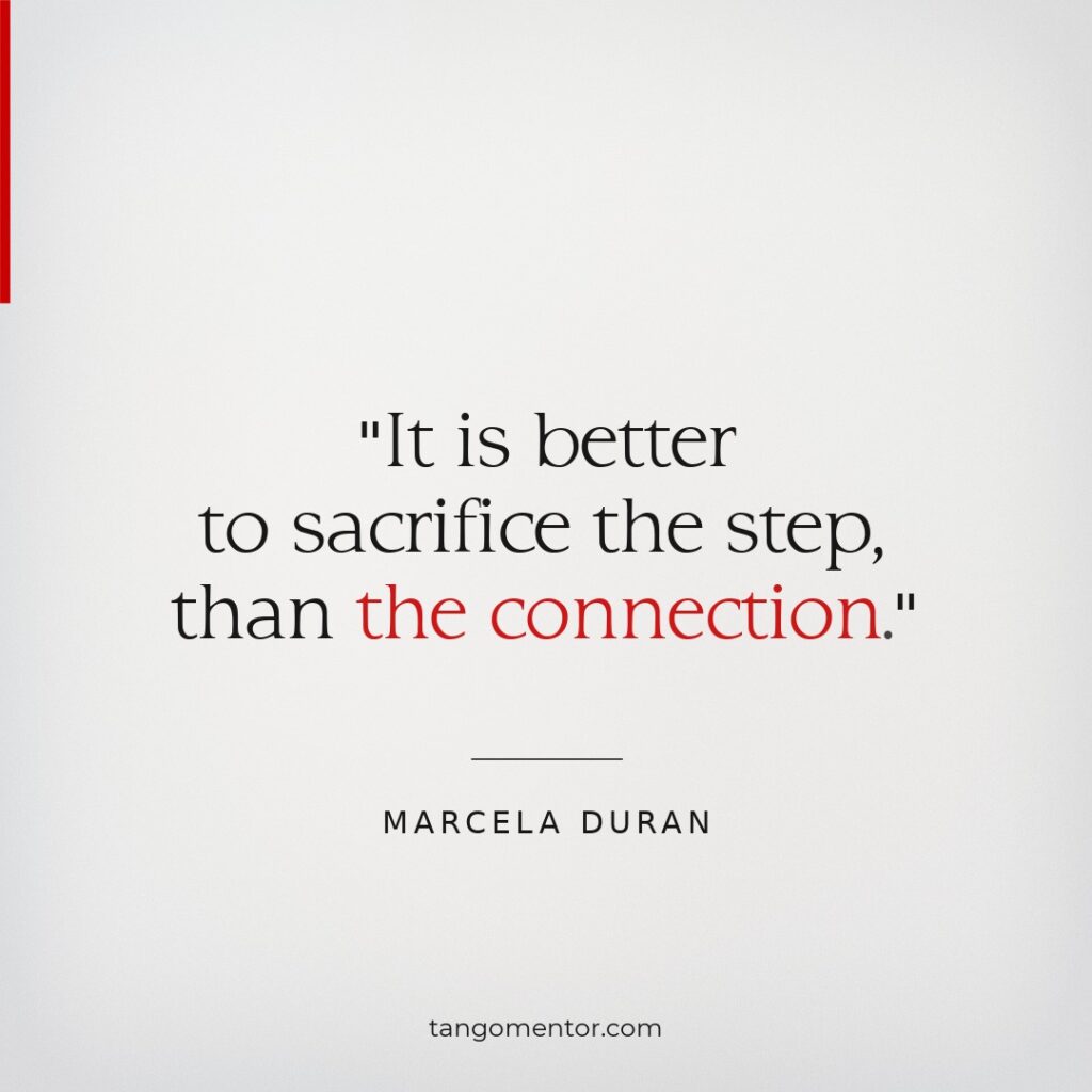 How to achieve it: This is not simple. While dancing, many thoughts and feelings can pass through your mind: how the music feels, what people watching you think, what your teacher said, how the ronda flows. To maintain great connection, learn to push all of these into the background. For example, develop the ability to dance with musicality without needing to focus too much, so your attention can remain on your partner. That’s why experience matters.